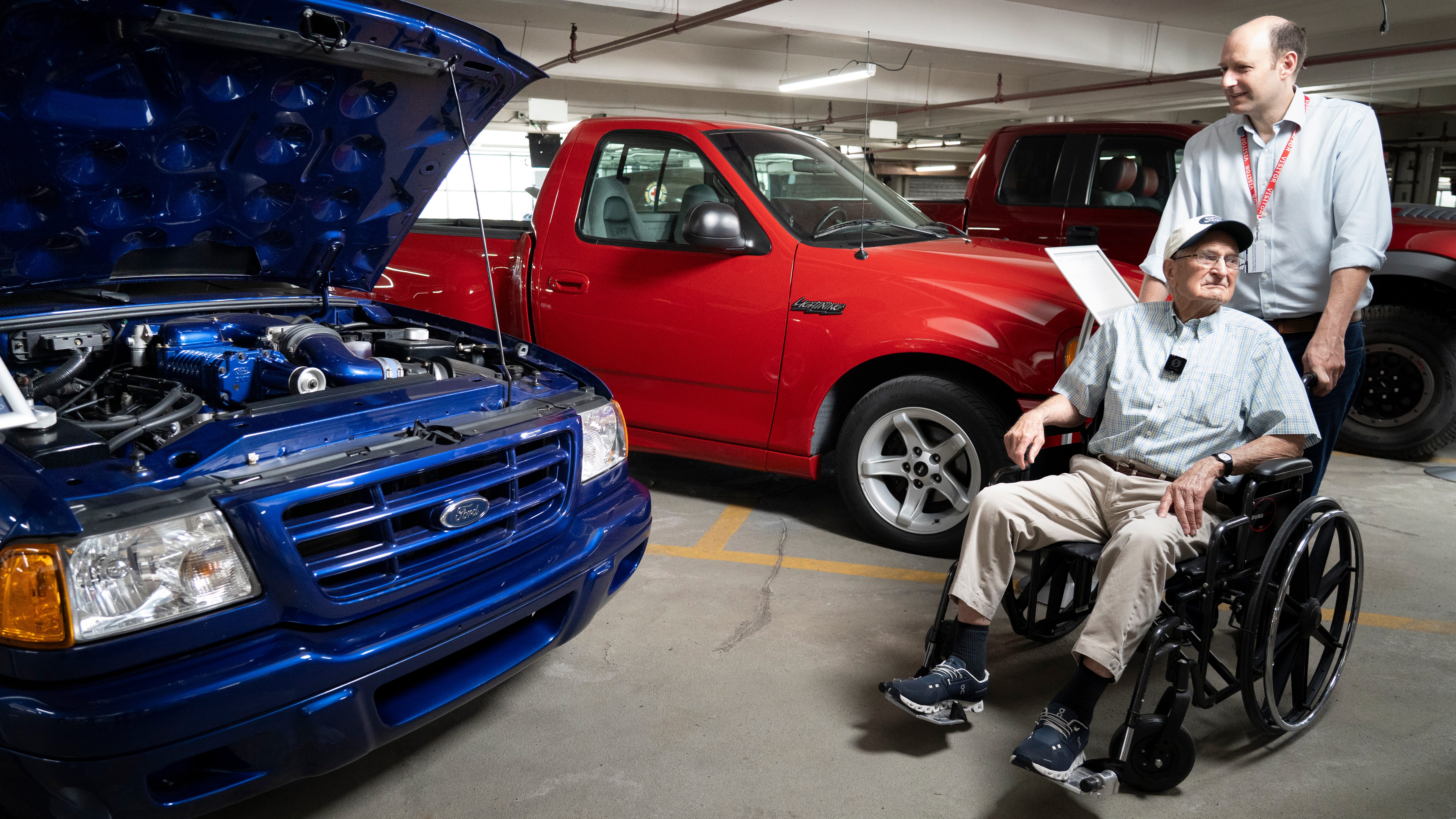 Bill McCubbin, 102, of Madison, Indiana, toured the Ford Heritage Fleet at Ford headquarters. Mr. McCubbin was previously a dealer in southeastern Indiana, where he began selling Fords in 1961.