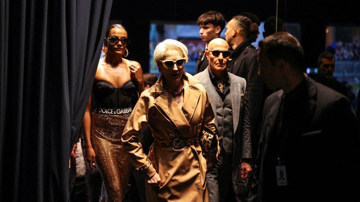 Meryl Streep re-embodied her fierce character in “Devil Wear Prada” alongside Italian Coscar Stanley Tucci at Milan Fashion Week on Saturday, September 27th.