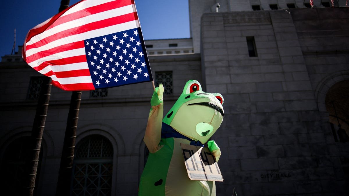 This is not the first time frogs have been used as a symbol of resistance at demonstrations against the Trump administration. Frog and animal costumes began to proliferate late last year after federal agents sprayed vents on participants’ frog costumes during protests in early October. Participants in nationwide “No Kings Day” protests have embraced the frog image, including those who dressed up as frogs outside a U.S. Immigration and Customs Enforcement facility in Portland, Oregon, in October.