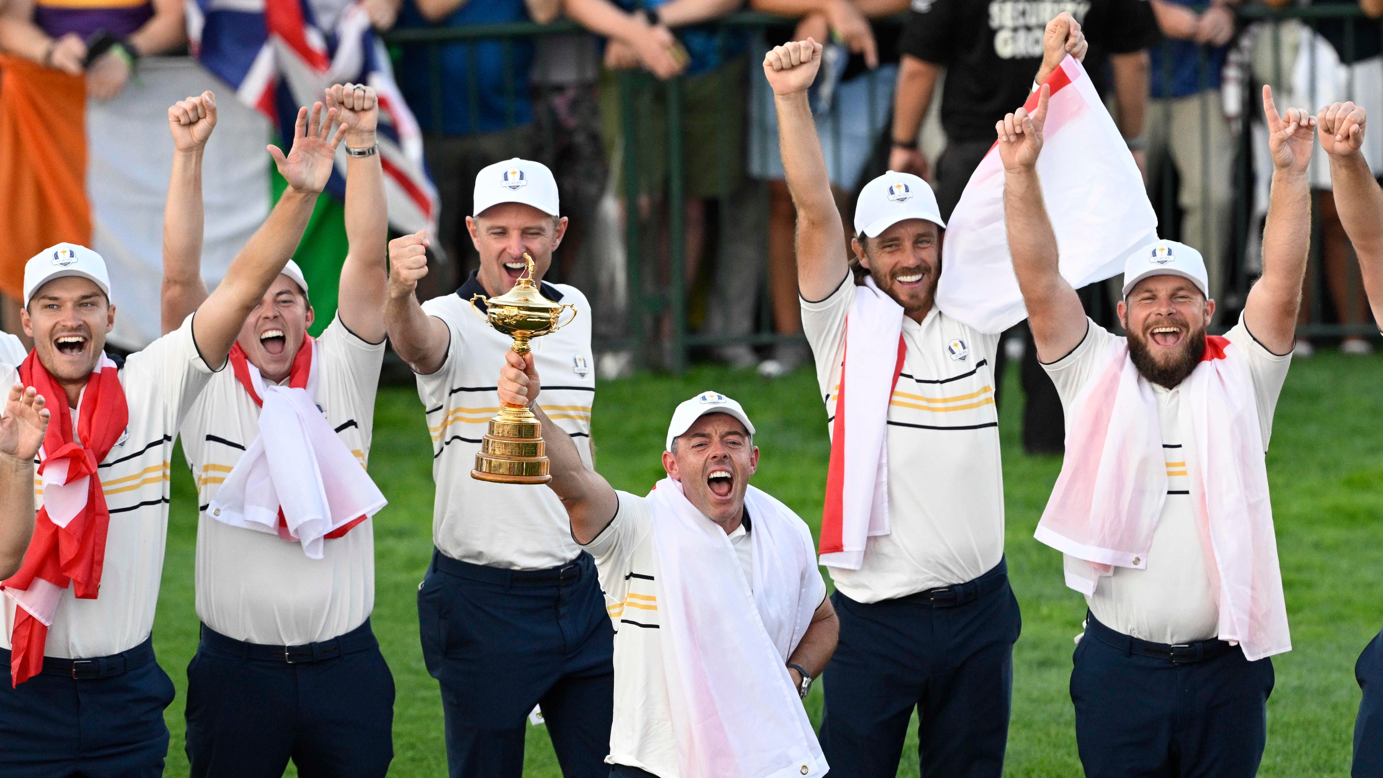 European Ryder Cup winners chant cards and trophies